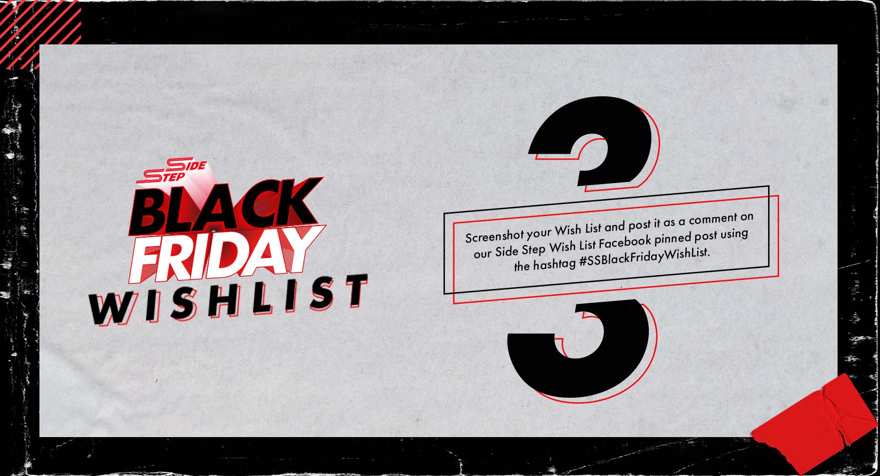 - The entrant's screenshot/snippet is to be posted on the Side Step Facebook business page and must include the hashtag #SSBlackFridayWishList in order to qualify as an entry.